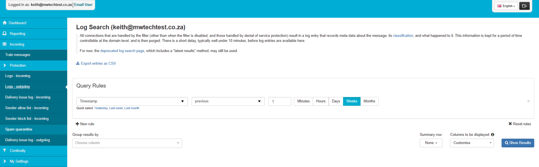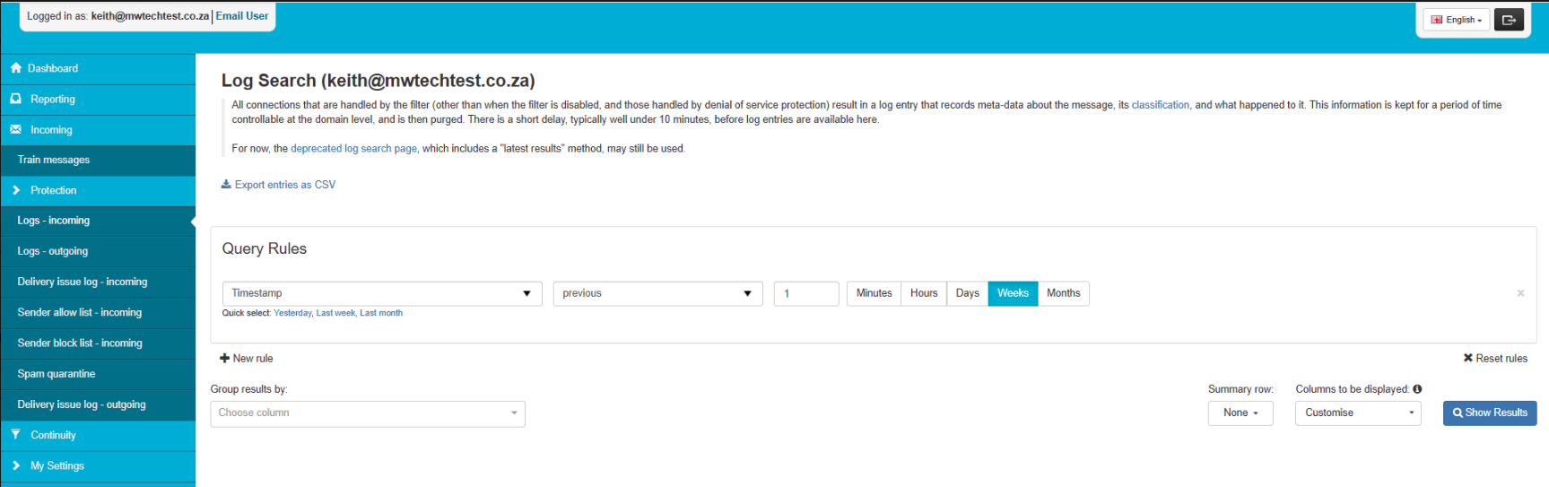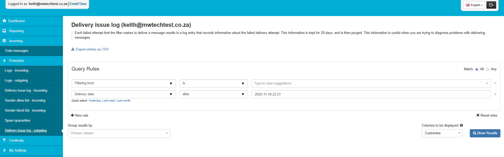 Use this tool to search through all incoming email activity. You can check message status, filtering decisions, timestamps, and delivery outcomes.
