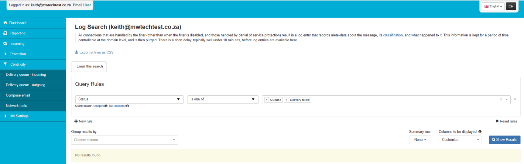 The Continuity section helps you keep mail flowing even when your mail server is down or delayed. It also lets you check queued messages, resend them, or send mail directly from the continuity portal.