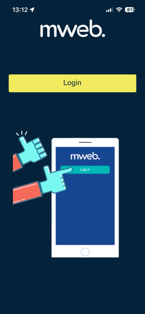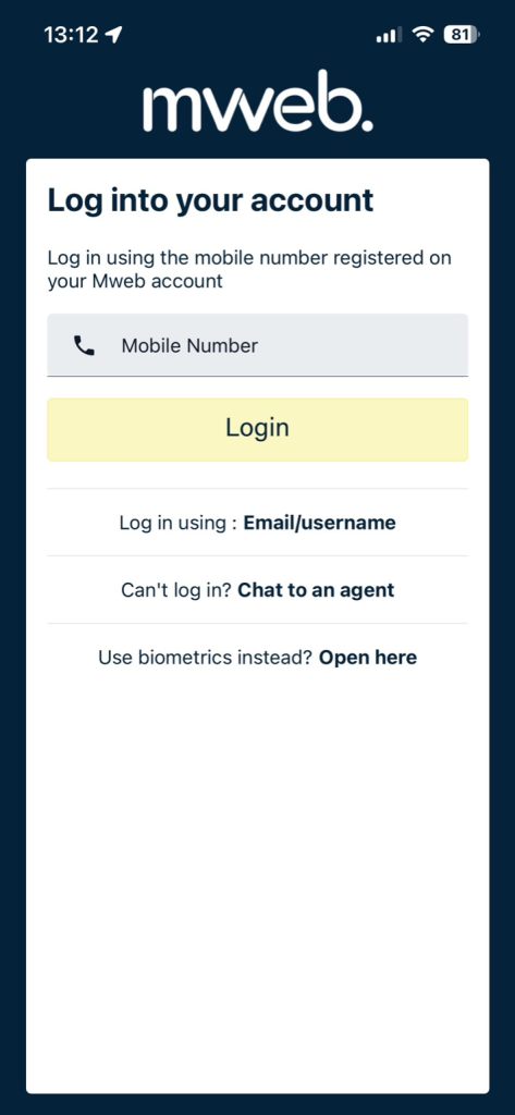 When you open the Mweb Mobile App, tap Login to get started. The app gives you a few different ways to sign in.